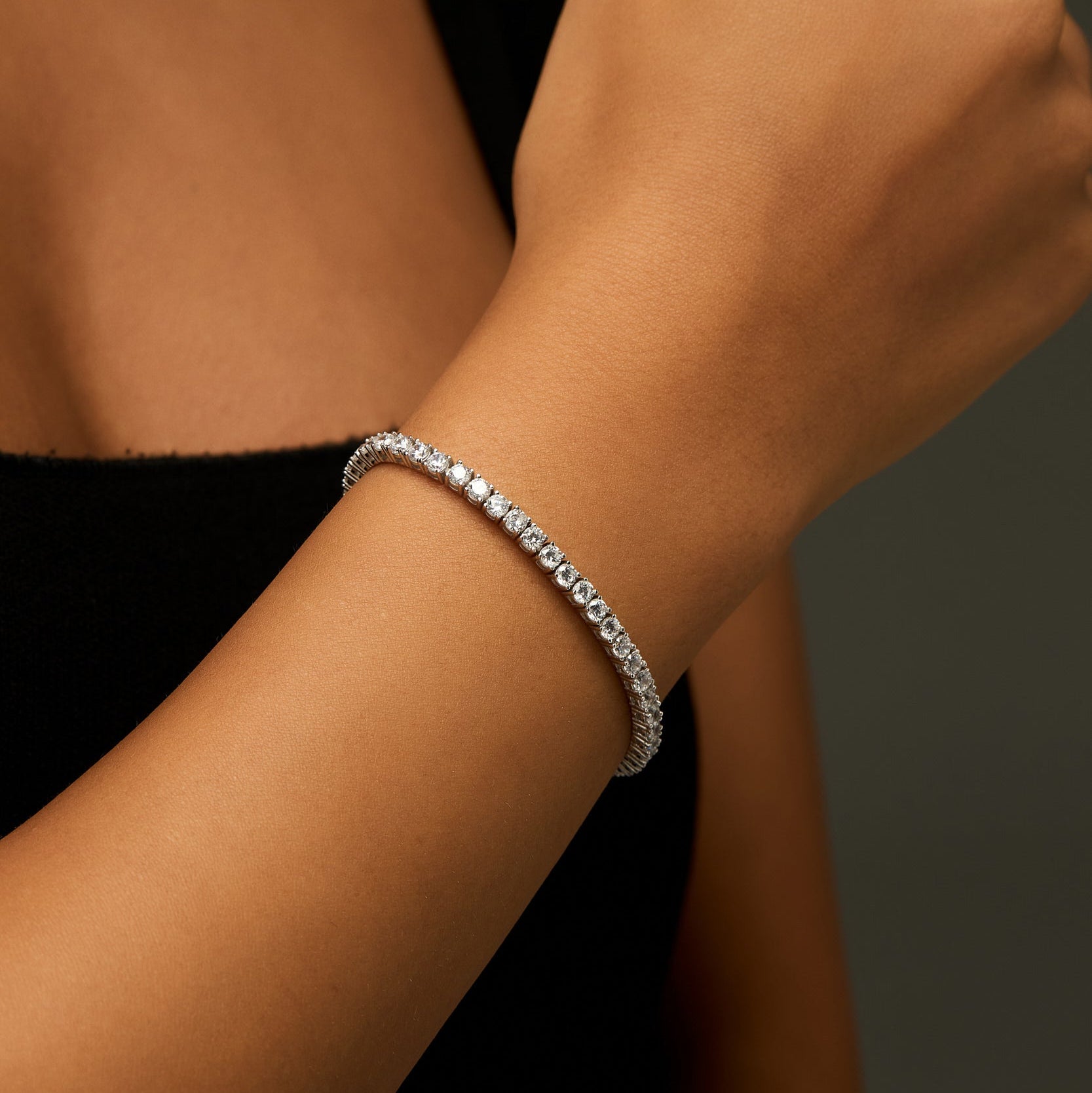 Remie Jewelry’nin zamansız ışıltısını yansıtan 3mm Su Yolu Bileklik, ince yapısı ve zarif taş dizilimiyle sade şıklığın en etkileyici hâlini sunar. Her biri özenle yerleştirilmiş yuvarlak kesim taşlar, ışığı kusursuz biçimde yansıtarak bileğinizde zarif bir parıltı oluşturur. Minimal formu sayesinde hem günlük kombinlerde zarif bir duruş sergiler hem de özel davetlerde sofistike bir tamamlayıcı olur. 925 ayar gümüş üzerine yüksek kaliteli rodyum kaplama ile üretilmiştir.