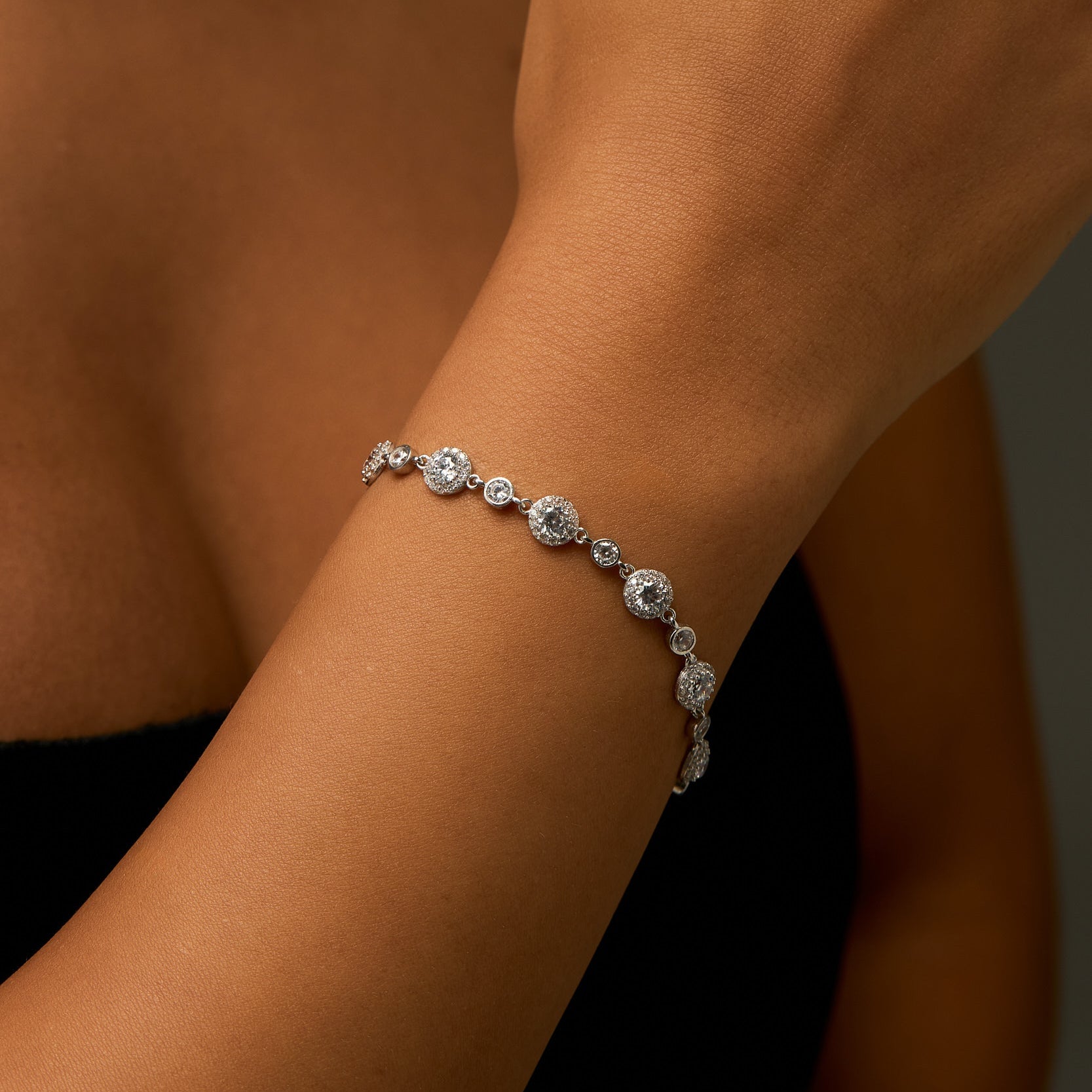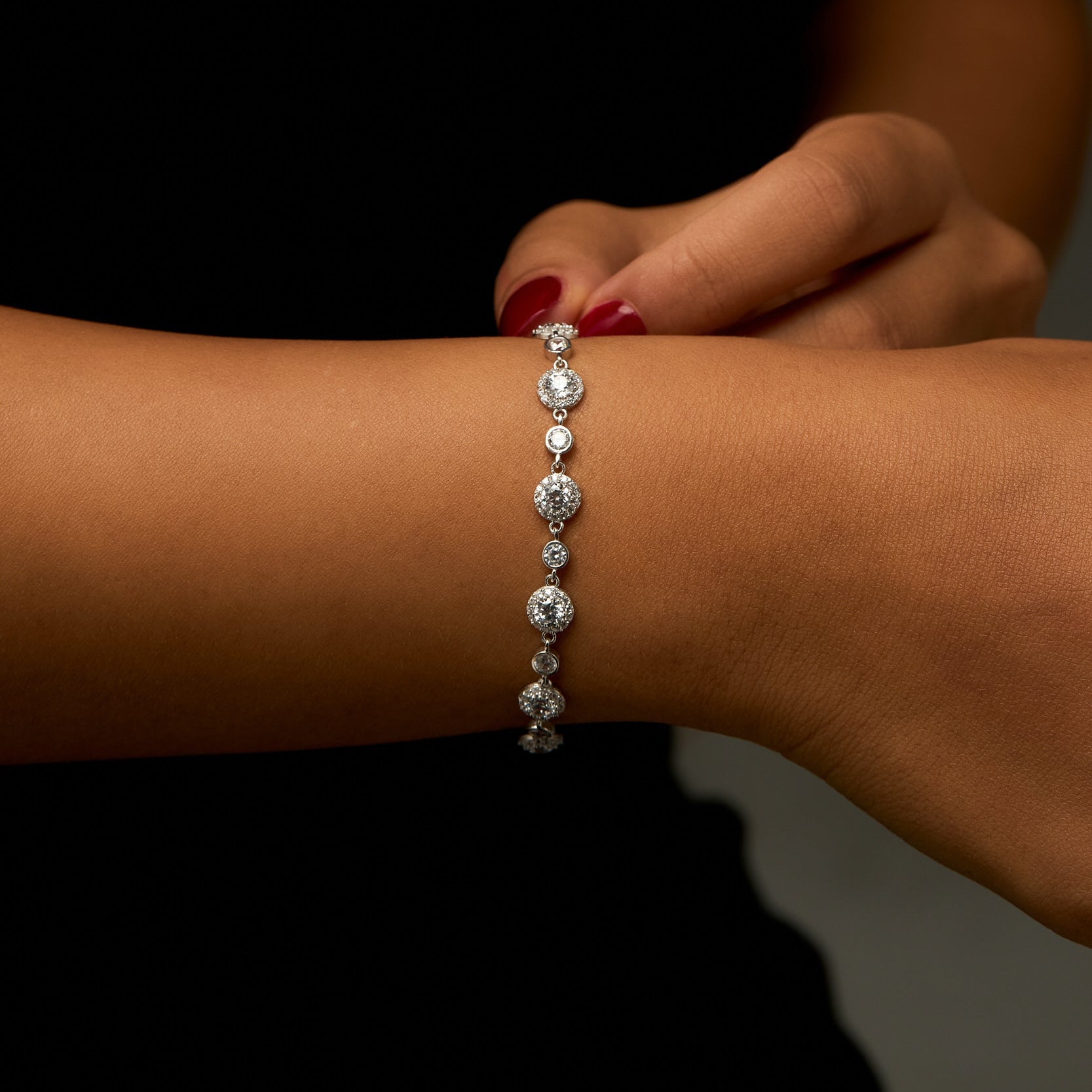 Remie Jewelry’nin zamansız zarafetini yansıtan yuvarlak kesim taş bileklik, klasik formu ve göz alıcı ışıltısıyla bilekte büyüleyici bir etki yaratır.