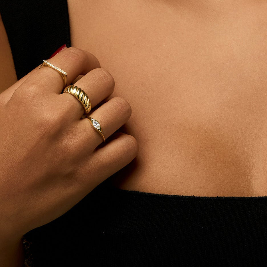 Tek başına kullanıldığında güçlü ve zarif bir ifade yaratır; farklı yüzüklerle kombinlendiğinde ise sofistike bir bütünlük sağlar.