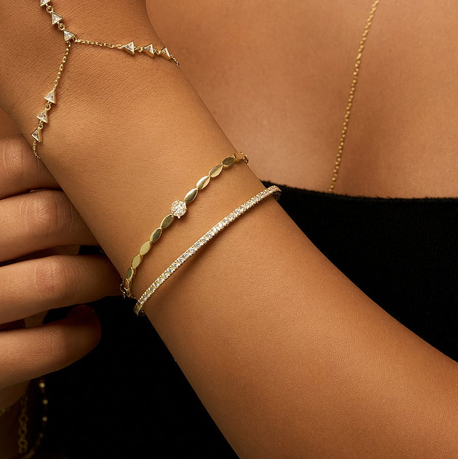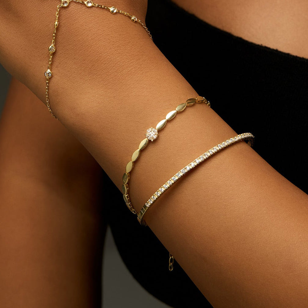 Remie Jewelry’nin zarif dokunuşunu yansıtan Solea Bileklik, sade şıklığıyla dikkat çeker. Altın tonun sıcak ışıltısı, merkezdeki ışıltılı taş detayıyla buluşarak bilekte zarif bir parıltı yaratır. Günlük kullanımlarda zarafetiyle öne çıkarırken, özel anlarda da sofistike bir tamamlayıcıdır.