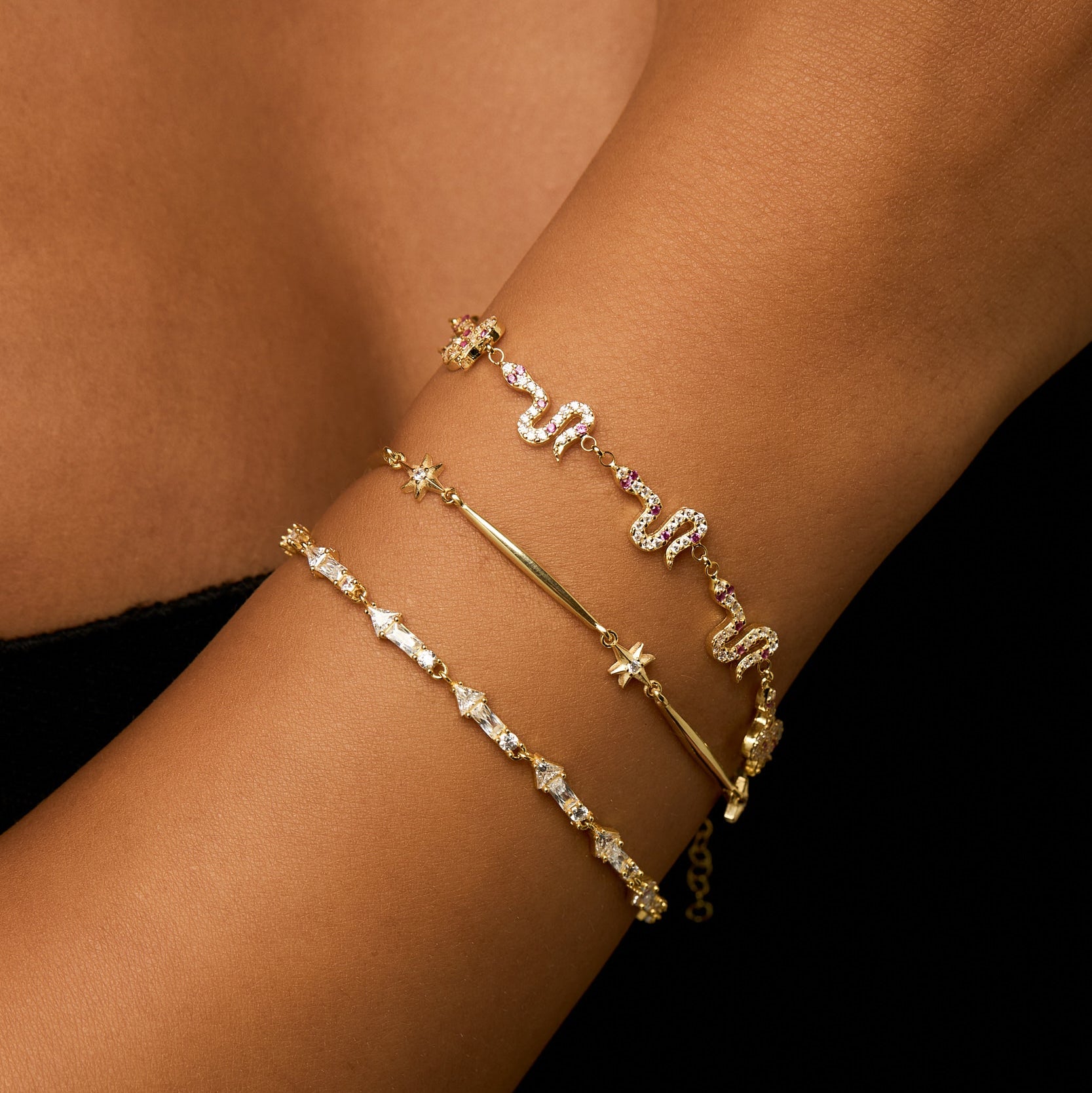 Her biri özenle yerleştirilmiş baget kesim taşları, bileğinizde modern ve ışıltılı bir çizgi oluşturur.